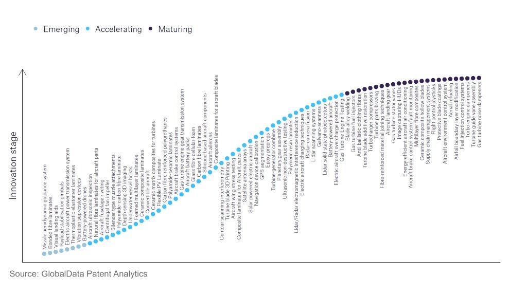 According to GlobalData’s Technology Foresights, which plots the S-curve for the aerospace and defence industry using innovation intensity models built on over 262,000 patents, there are 180+ innovation areas that will shape the future of the industry.