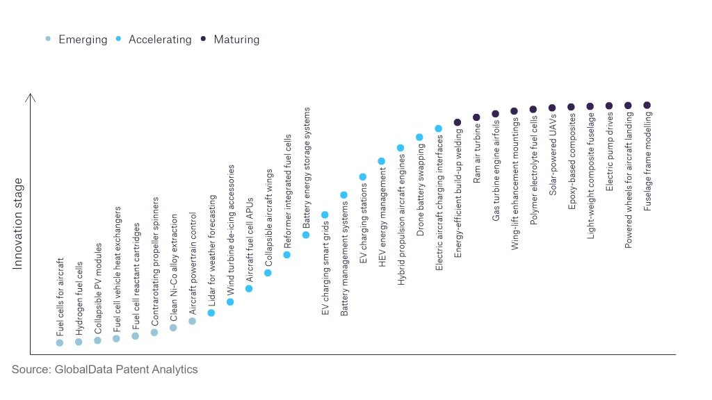 EV charging stations, hybrid propulsion aircraft engines, and electric aircraft charging interfaces are some of the accelerating innovation areas, where adoption has been steadily increasing. Among maturing innovation areas are fuselage frame modelling and powered wheels for aircraft landing, which are now well-established in the industry.
