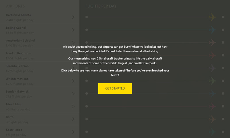 sing the air traffic data of ten very different airports over the course of 24 hours, international private hire company Addison Lee developed an interactive tool that illustrates their daily take-offs and landings.